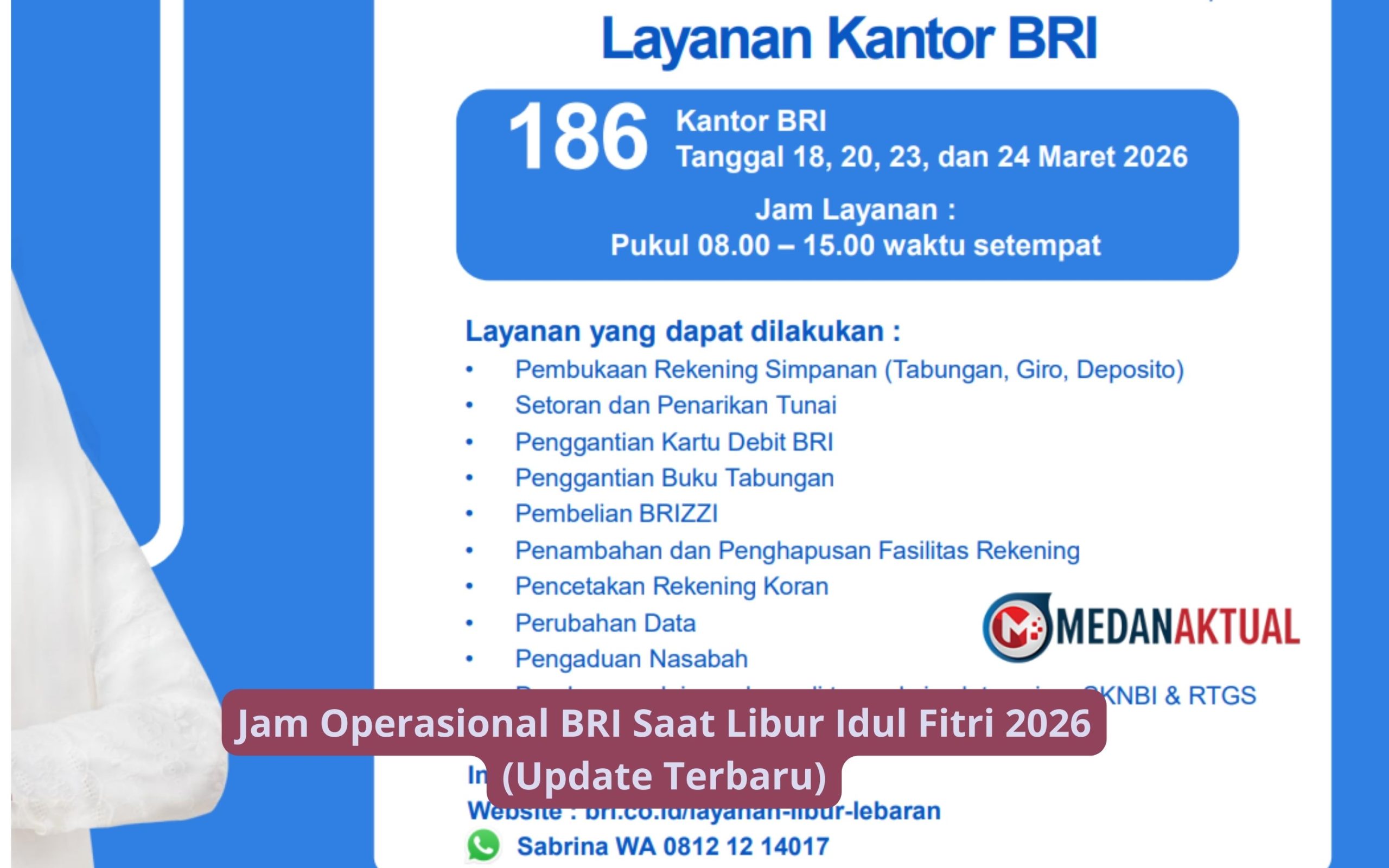 Berdasarkan informasi terbaru dari situs bri.co.id, dijelaskan BRI saat libur lebaran Idul Fitri 2026 tetap beroperasional dengan biasanya, dengan ketentuan jadwal dan waktu tertentu.